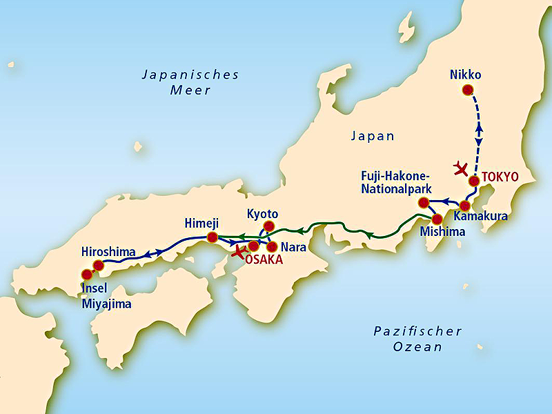Besuchen Sie die „Burg des weißen Reihers“ in Himeji, die Stadt Hiroshima und die Insel Miyajima. Außerdem erwarten Sie ein Ausflug nach Nara und die historische Stadt Kyoto – optimal geplant für ein unvergessliches Japan-Erlebnis.
